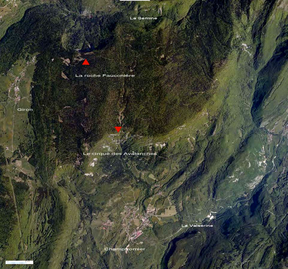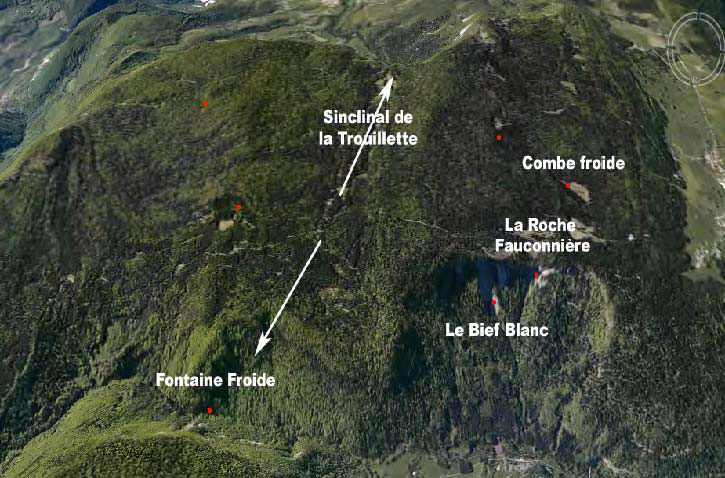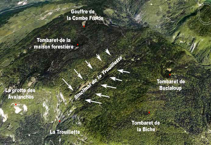 Sur cet extrait de carte IGN, on peut situer l'exsurgence des Avalanches (en bas, peu lisible, en bleu sous le mot Avalanche) et la grotte du Pas-du-Bœuf (qui serait encore plus bas sous ce lieu-dit), la grotte de la Roche Fauconnière (tout en haut), les Abrans, et divers tombarets et gouffres.