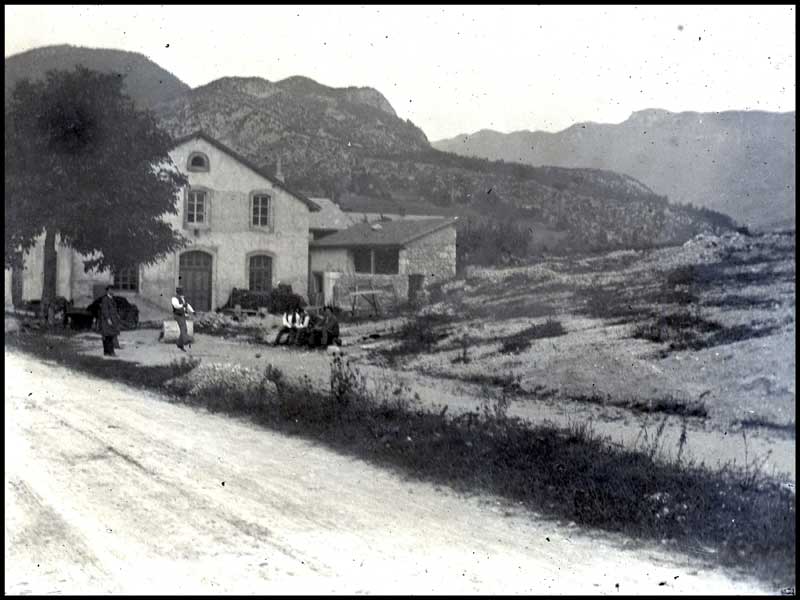 Cette photographie sur plaque inédite est sans conteste la plus ancienne (et la seule ?) montrant la pratique de ces boules lyonnaise à Champfromier. La prise de vue pourrait dater d'août 1925. Elle fut prise devant la forge d'Eloi Ducrest (actuelle maison Leclercq, n° 661 rue des Burgondes, dont la forme caractéristique des portes et fenêtres du pignon est encore bien visible, mais dont les bâtiments à l'arrière ont disparu). Au premier plan on distingue deux hommes, l'un portant la traditionnelle blouse rullière, l'autre venant de lancer sa boule. Derrière, quatre hommes sont assis sur un banc, spectateurs ou acteurs en attente de leur tour... A cet emplacement sera ensuite installé une partie de la forge d'Eloi, le travail (pour ferrer chevaux et bœufs) et une grosse pierre qui servait de support à l'enclume.