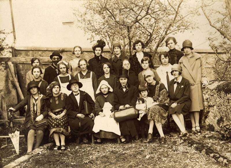 Parmi les nombreuses activités de l'abbé Pochet, et ses diverses productions théâtrales à Champfromier, cette photographie nous rappelle la fameuse Bécassine ! Le caractéristique bonnet de Bécassine est porté par Denise Ducrest, au centre du premier rang.