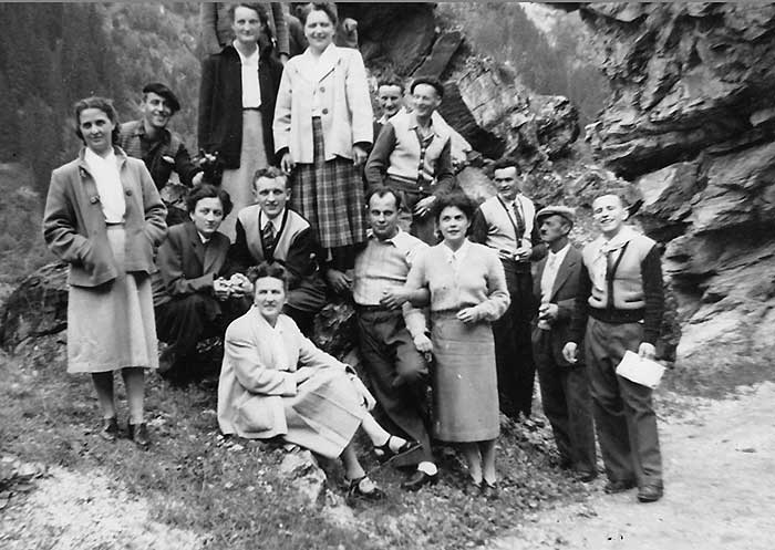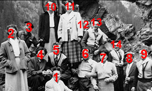 1) Germaine DUCRET ; 2) Marie-Thérèse TOURNIER, dite Mimi ; 3) Roland DUCRET, dit Lolo ; 4) Jeannine BORNET (ép. Jacquemoux) ; 5) Fermand (André?) THOMAS (ouvrier Vosgien de Bussang, travaillant à la scierie de Cyrille Ducret) ; 6) André BORNET, dit Dédé (frère de Jeanine n° 4) ; 7) Simone DUCRET (ép. Albert Avet) ; 8) Victor TOURNIER (père de Mimi,n° 2) ; 9) Jean DUCREST ; 10) Marie-Thérèse MARQUIS, dite Mimi (ép. Godet de Charix) ; 11) Denise DUCREST (sœur de Jean, n° 9) ; 12) Albert TOURNIER, dit Bébert ; 13) Aimé VUILLERMOZ ; 14) Raymond DUCRET (frère de Maurice Ducret-Thadet).