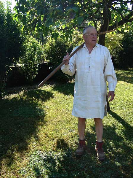 Cette chemise provient aussi de la lingerie de César Ducret. Elle était portée dans les premières années de 1900. Pour la photographie, Albert Avet a bien voulu endosser cette chemise de chanvre : c'est rugueux !