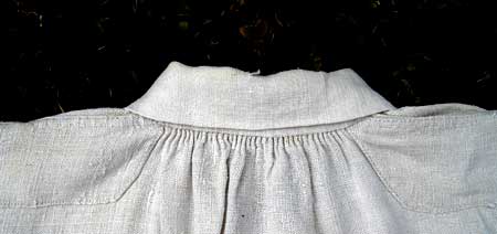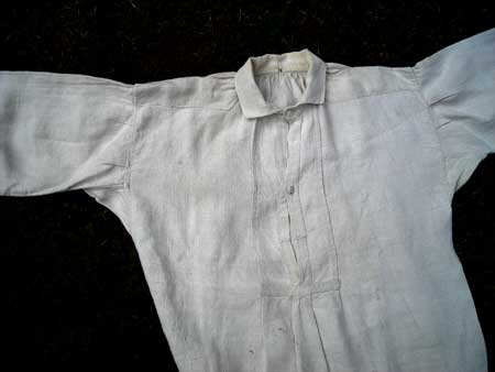 La chemise rentrait dans un pantalon (dont on n’a pas trouvé d’exemplaire) et était maintenue à la taille par une ceinture de flanelle, de couleur écru. On pourra apprécier le soucis du confort et la qualité du travail de la couturière, avec des renforcements aux épaules, des soufflets sous les bras, aux épaules, et même au bas de la chemise, une ouverture facile avec deux seuls boutons et des renforts intérieurs et extérieurs évitant les risques d'arrachements, sans oublier des fronces dans le dos sous le col, toute cette grosse toile de chanvre évidemment cousue à la main !