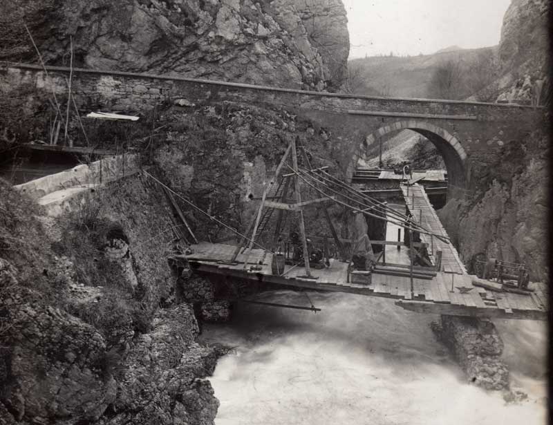 La photographie (12,5 cm x 17,5 cm) fut prise dans la direction de Champfromier. Le ponton transversal de travail, fait de simples planches, surmonte les flots tumultueux sans aucune protection ! Il semble prendre appui sur des gabions, sortes d’entassements de blocs de pierres maintenus par un grillage. Le matériel se met en place, on distingue des treuils, enclume et objets divers. Pour l'autre partie du ponton de travail, celle dans le sens du courant, cette fois une protection est en place. Mais pouvait-on se sentier en sécurité avec cette frêle rambarde que l'on distingue sur la gauche du plancher ! Près du bord gauche de la photographie, on voit la "tourne", le lieu où l’eau tournait avant son usage. Il y en avait une aussi avant les scieries de Champfromier. A droite, on ne voit malheureusement pas la cabane du douanier.
