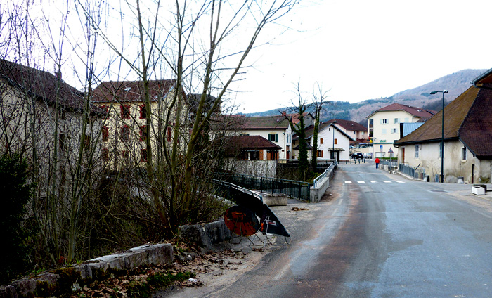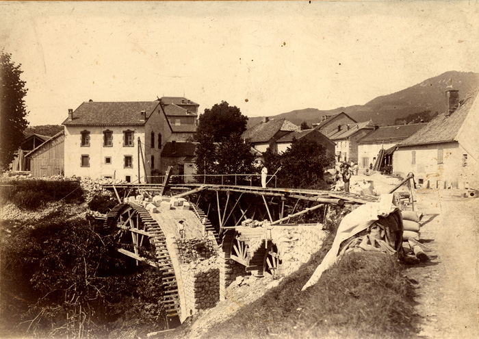 A droite on reconnaît la "maison Evrard" (l'un des quatre pans de la toiture) et ses escaliers en lauzes sur le toit pour accèder à la cheminée. Derrière cette maison on devine la scierie, à quelques madriers en appui sur la toiture. A gauche, on voit bien l'arrière de l'actuel Restaurant Ducret (qui n'a pas encore été surélevé d'un étage), et le lavoir, tandis que derrière on reconnaît la toiture de la mairie-école. Le moulin communal n'est pas encore en construction, des maisons ont été remplacées à proximité du carrefour (voir photo comparative actuelle, ci-dessous).