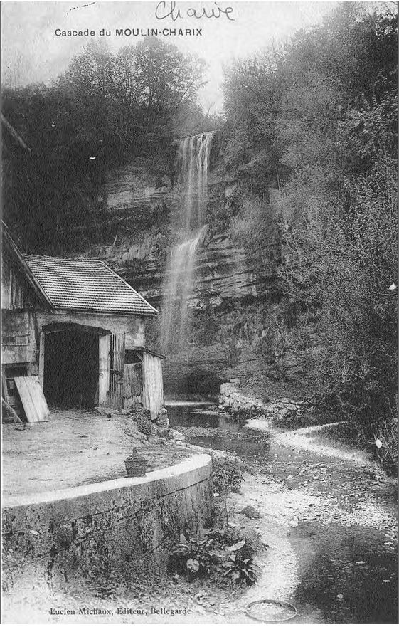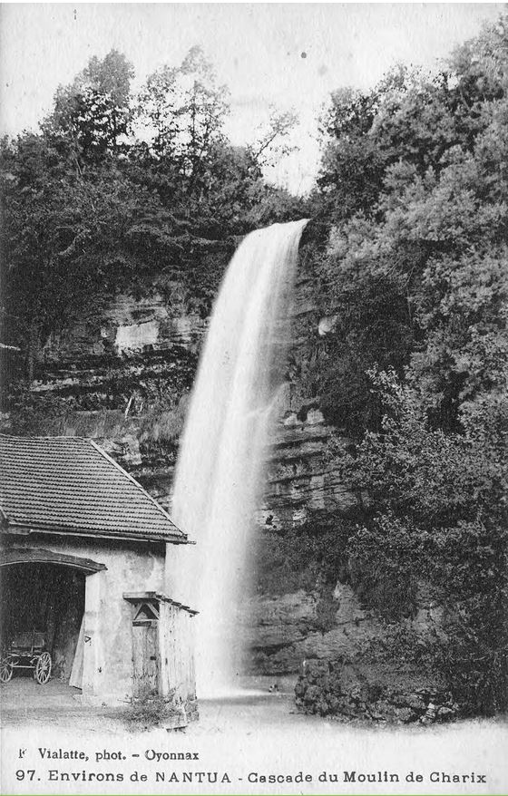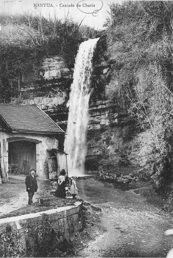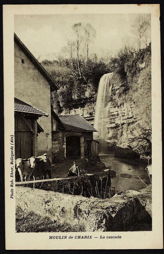 Outre le cliché daté de 1871, et une lithographie bien connue des antiquaires, la cascade de Charix a été très souvent prise comme thème principal de nombreuses cartes postales anciennes (voir ci-dessous). Signalons qu'actuellement le ruisseau de cette cascade prend sa source sous l'autoroute, et qu'il fut certainement jadis bien plus important puiqu'il traverse une pierre percée, encore plus spectaculaire que celle deChampfromier.