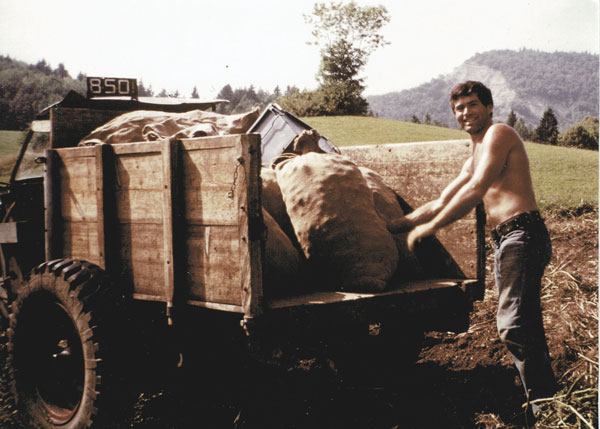 Gilbert se souvient bien que, chaque jour des étés de sa jeunesse, il montait à pied apporter le repas aux hommes qui fauchaient à Cinq Chalets. Il n’y avait pas alors de tracteur mais des B 14, des véhicules Citroën réhabilités, dont les rapports étaient aménagés par le forgeron du village (ou Chaumontet, à Bellegarde) pour en faire de puissants véhicules tout terrain ! L’ennui, c’est que lorsqu’ils tiraient les chars surchargés du foin et qu’ils descendaient à la ferme du bas, les freins n’étaient pas assez puissants… Aussi l’on abattait un arbre et on l’attachait derrière le véhicule : l’amas des feuilles et des branchages faisant office de frein ! Un frein écologique en quelque sorte, efficace, facile à trouver et à remplacer. Et l’on en changeait souvent ! Ainsi, lorsque dans la descente l’arbre déviait du tracé de la route et partait dans le précipice, on n’allait pas le récupérer, on en coupait un autre sur place ! Maintenant il en rigole ! C’était la belle époque, peut-être !